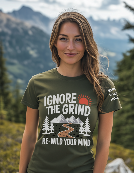 Ignore the Grind Rewild Your Mind Shirt - Hiking Nature T-Shirt - Outdoorsy Unisex Tee - Escape 9 to 5 Shirt - Rewilding Hiker Gift