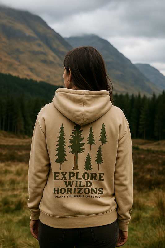 Explore Wild Horizons Hoodie – Plant Yourself Outside – Tree Graphic Hoodie – Sand Colour Hiking Sweater – Nature Lover Gift – Outdoorsy Hoodie