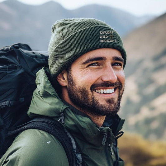 Olive Green Organic Cotton Beanie | Hiking Gift | Explore Wild Horizons | Walking | Cuffed Beanie | Embroidered | Comfortable Beanie | Eco