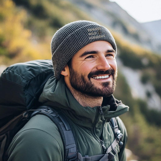 Grey Organic Cotton Beanie | Hiking Gift | Explore Wild Horizons | Walking | Cuffed Beanie | Embroidered | Comfortable Beanie Graphite Grey