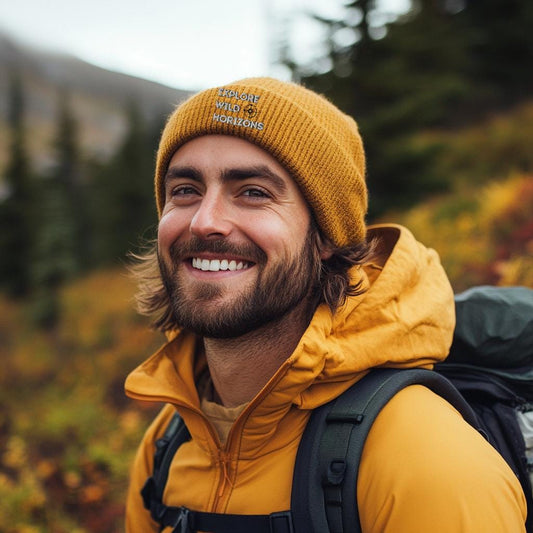 Mustard Organic Cotton Beanie | Hiking Gift | Explore Wild Horizons | Walking | Cuffed Beanie | Embroidered | Comfortable Beanie