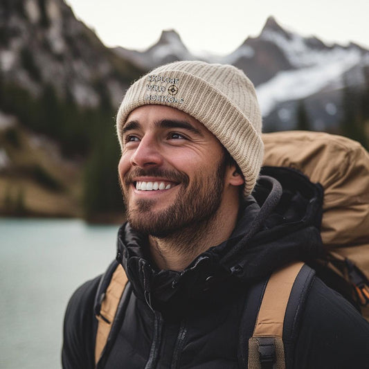 Sand Organic Cotton Beanie | Hiking Gift | Explore Wild Horizons | Walking | Cuffed Beanie | Embroidered | Comfortable Beanie | Gift For