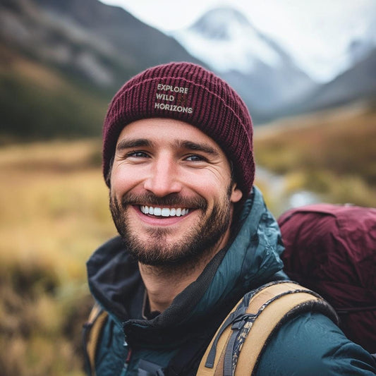 Burgundy Organic Cotton Beanie | Hiking Gift | Explore Wild Horizons | Walking | Cuffed Beanie | Embroidered | Comfortable Beanie | Eco